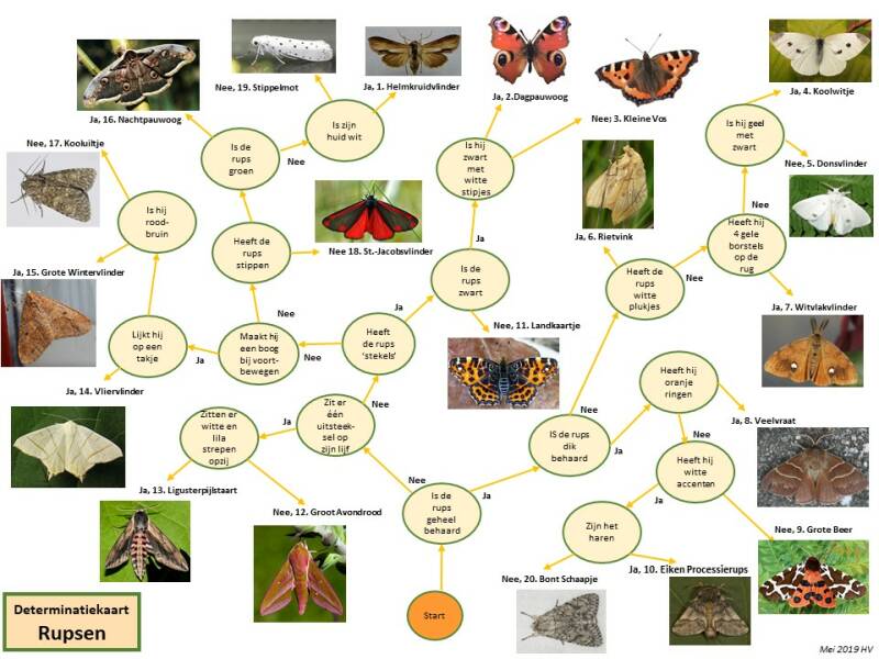 Uit welke rups welke vlinder groeit kun je bepalen door je vraag-stappen te beantwoorden.